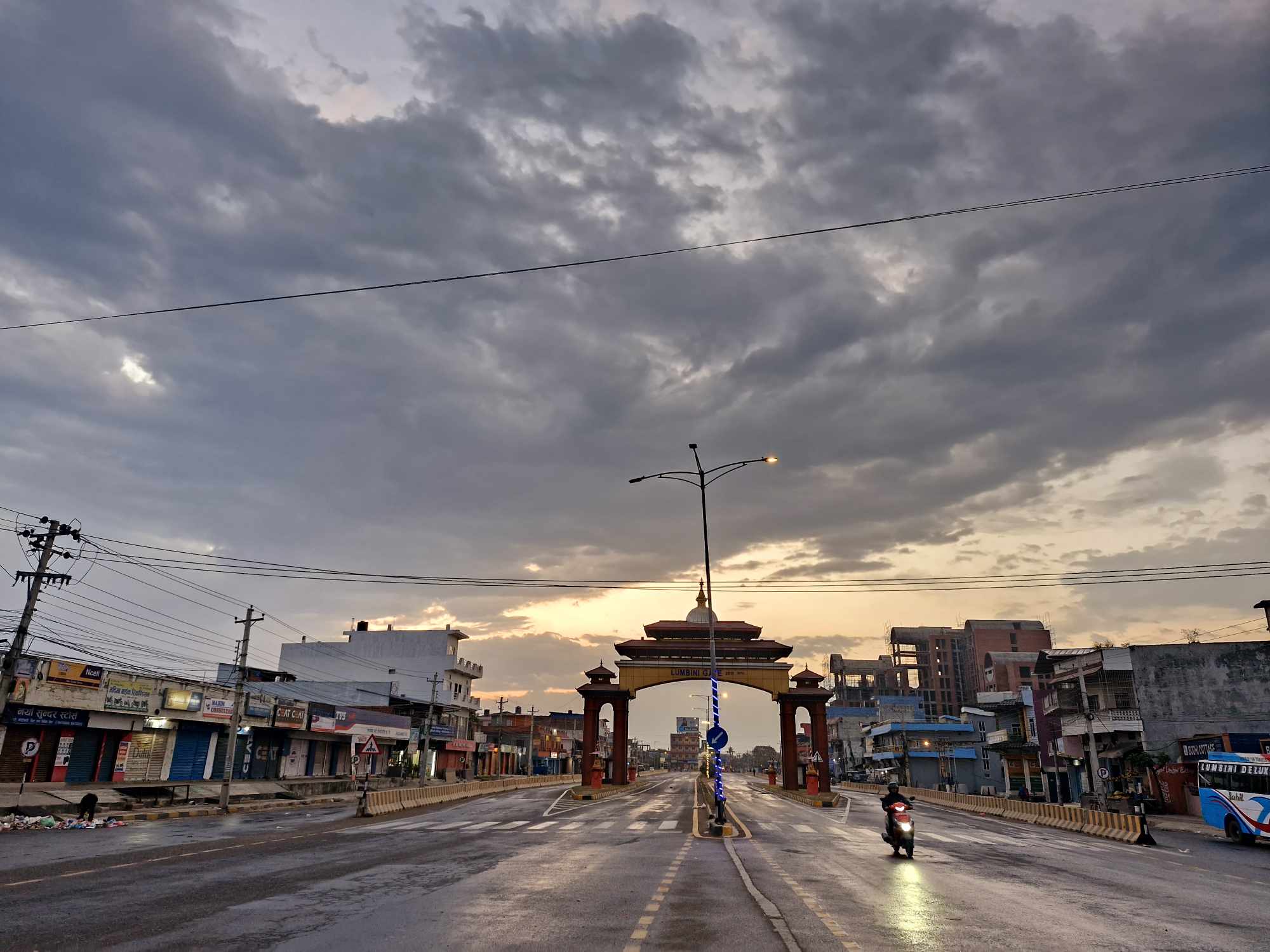साेमबार एकाबिहानै भैरहवा स्थित लुम्बिनी गेटबाट देखिएकाे दृश्य । बिहान केही बेर आकाशबाट पानिका थाेपा परेता पनि पानी परेन । तर भैरहवाकाे उत्तरि पश्चिमि क्षेत्रकाे आकाशमा बादल भने लागेकाे छ । साेहि बादलमुनि देेखिएकाे आकर्षक लुम्बिनी गेट ।