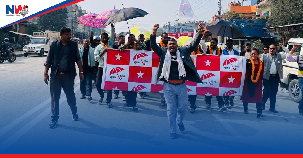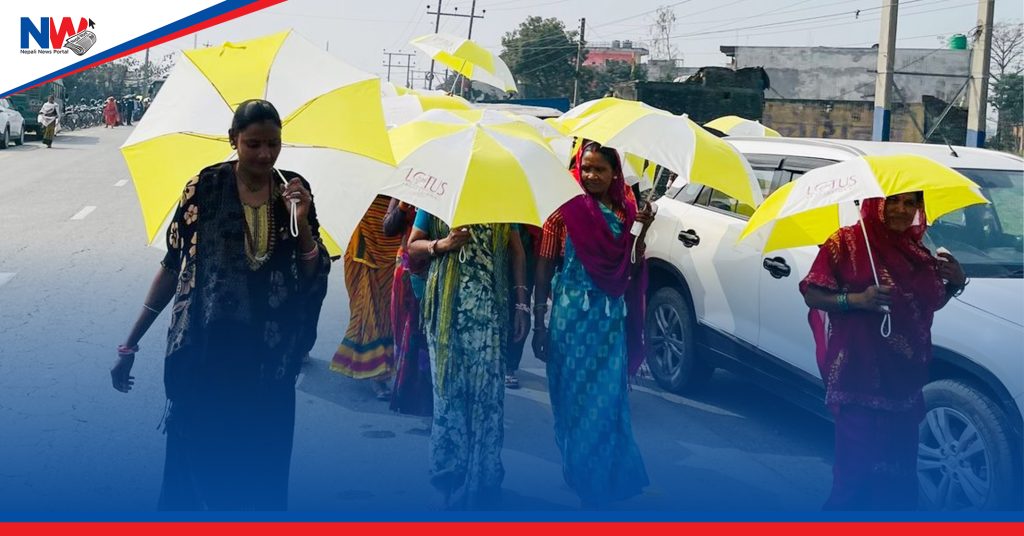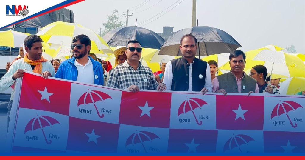 सयौको संख्यामा रंगी विरंगी छाता ओढेर महिला तथा पुुरुषहरु निर्वाचन क्षेत्रमा चुनाबी प्रचारमा खटिएका छन् ।