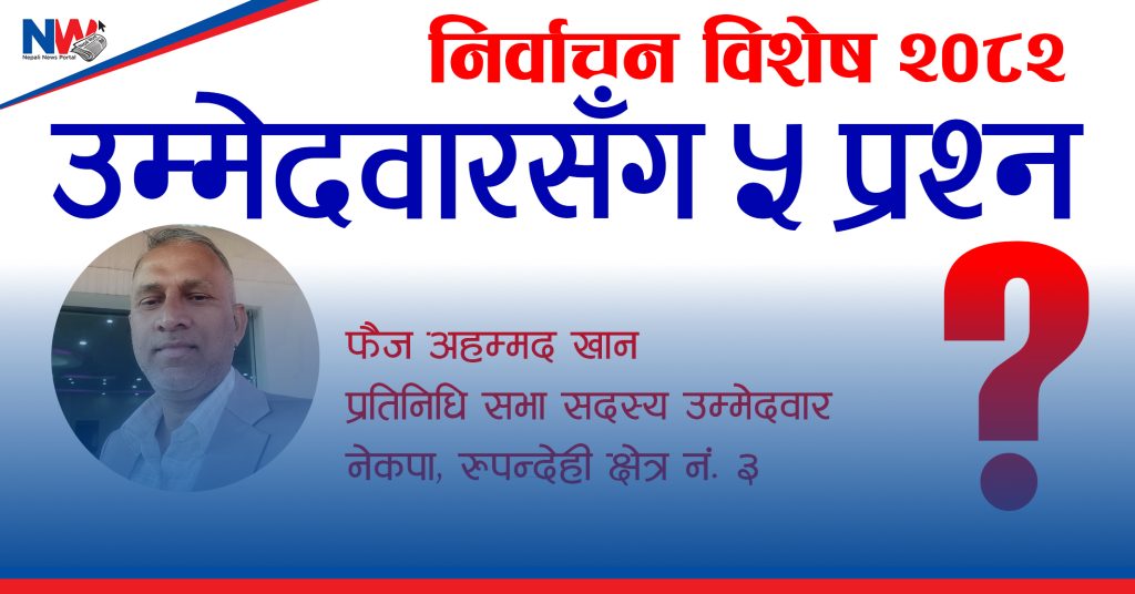 आगामि फागुुन २१ गते हुुन गईरहेको प्रतिनिधि सभा सदस्य पदको निर्वाचनकोलागि उम्मेदवारी दिएकाहरु यतिबेला घरदैलो गरिरहेका छन् । यो प्रतिनिधीसभा निर्वाचनको सन्दर्भमा उम्मेदवारहरु सबै मतादातालाई भेट्न पनि सक्दैनन । किनकी समय थोरै छ, मतादाता धेरै छन् । यसैले सञ्चार माध्ययमको दायित्व बुझेर उम्मेदवारहरुको मुुख्य चुुनाबी कार्यक्रम सहितको कुराहरु समेटेर नेपाल वर्ड डटकमले उम्मेदवारसँग ५ प्रश्न निर्वाचन विशेष स्तम्भ शुरु गरेको छ । हाम्रो यो स्तम्भ सञ्चालन गर्नुको मुुख्य उद्धेश्य उम्मेदवारहरुको कार्यक्रमलाई मतादाता समक्ष पुराउने हो । निर्वाचन विशेषको सो स्तम्भकोलागि रुपन्देही क्षेत्र नम्बर ३ मा नेकपाका तर्फबाट उम्मेदवार रहेका उम्मेदवार फैज अहमद खानसँग हाम्रा सहकर्मि अस्मिता अधिकारी र मनोज क्षेत्रीले गरेको कुराकानिको सम्पादित अंशः