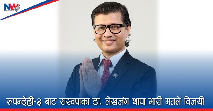 भैरहवा, २३ फागुन। रुपन्देही निर्वाचन क्षेत्र नम्बर ३ बाट राष्ट्रिय स्वतन्त्र पार्टी (रास्वपा) का उम्मेदवार डा. लेखजंग थापा प्रतिनिधिसभा सदस्यमा निर्वाचित भएका छन्।