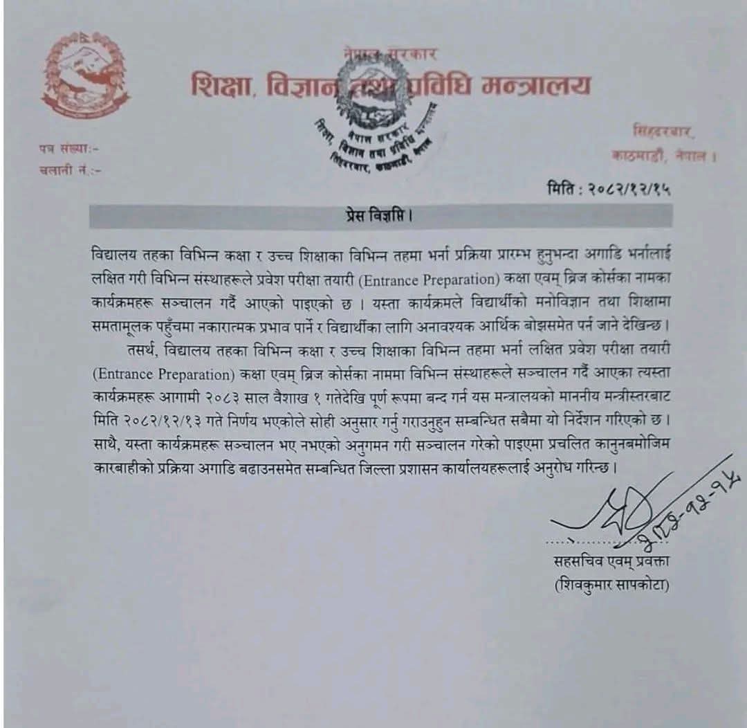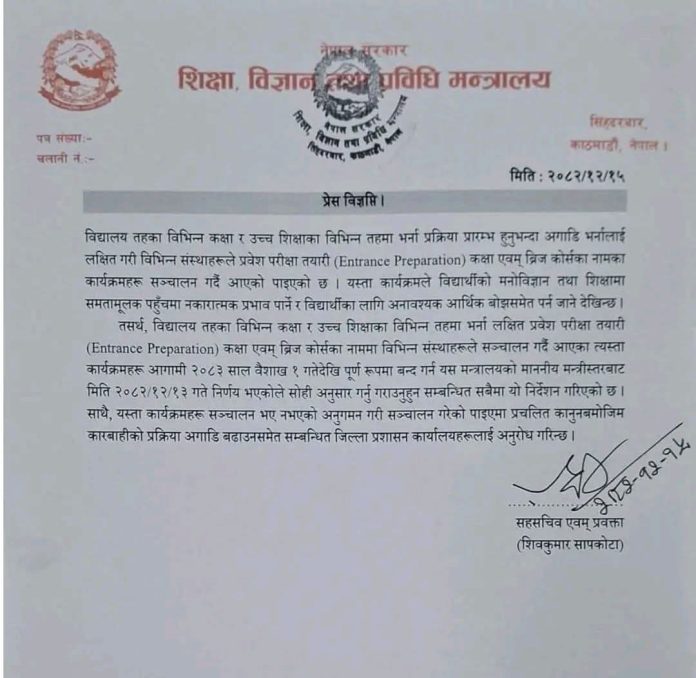 मन्त्रालयका सहसचिव एवम् प्रवक्ता शिवकुमार सापकोटाद्वारा हस्ताक्षर गरि जारि गरिएकाे विज्ञप्तिमा भनिएकाे छ, “विद्यार्थीको मनोविज्ञान तथा शिक्षामा समतामूलक पहुँचमा नकारात्मक प्रभाव पार्ने र विद्यार्थीका लागि अनावश्यक आर्थिक बोझसमेत पर्न जाने देखिन्छ। तसर्थ, विद्यालय तहका विभिन्न कक्षा र उच्च शिक्षाका विभिन्न तहमा भर्ना लक्षित प्रवेश परीक्षा तयारी कक्षा एवम् ब्रिज कोर्सका नाममा विभिन्न संस्थाहरूले सञ्चालन गर्दै आएका त्यस्ता कार्यक्रमहरू आगामी २०८३ साल वैशाख १ गतेदेखि पूर्ण रूपमा बन्द गर्न यस मन्त्रालयको माननीय मन्त्रीस्तरबाट निर्णय भएकोले सोही अनुसार गर्नु गराउनुहुन सम्बन्धित सबैमा यो निर्देशन गरिएको छ ।”