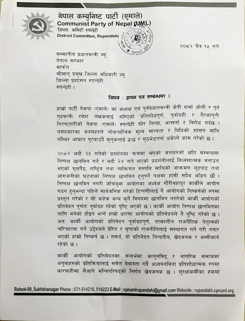 आइतबार देशभरका ७७ वटै जिल्लामा एमालेले विरोधस्वरूप सम्बन्धित जिल्ला प्रशासन कार्यालयमार्फत सरकारलाई ज्ञापनपत्र बुझाएको हो। रुपन्देहीमा समेत आयोजित कार्यक्रममा जिल्ला कमिटीले जारी गरेको विज्ञप्तिमा सरकारले उच्चस्तरीय छानबिन समितिको नाममा राजनीतिक पूर्वाग्रहका आधारमा प्रतिशोधपूर्ण कदम चालिरहेको आरोप लगाइएको छ।