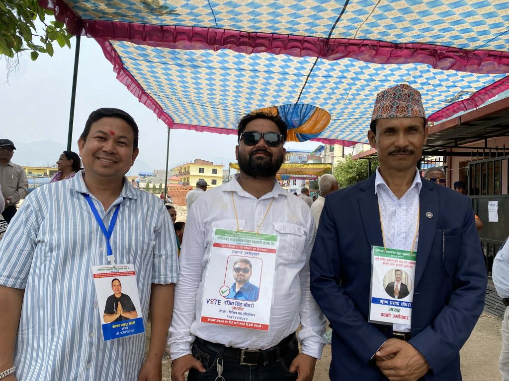 पद एक उम्मेदवार तीन- बुटवल उपमहानगर पालिका वडा नं ११ स्थित प्रगतिनगर सामुदायिक विद्युत सहकारी संस्था लिमिटेडको अध्यक्ष एक पदकोलागि ३ जना प्रत्यासी सामुहिक तस्वीर खिचाउँदै । १६ सदस्यीय कार्यसमितीकोलागि कृष्ण प्रसाद चौधरी, कैलाश खड्की र रन्जित चौधरीले अलग अलग प्यानल बनाई चुनाबी मैदानमा उत्रीएका छन् । यो संस्थामा १६ सय भन्दा बढी सदस्य रहेका छन्। तस्वीरः नरेश /नेपाल वर्ड